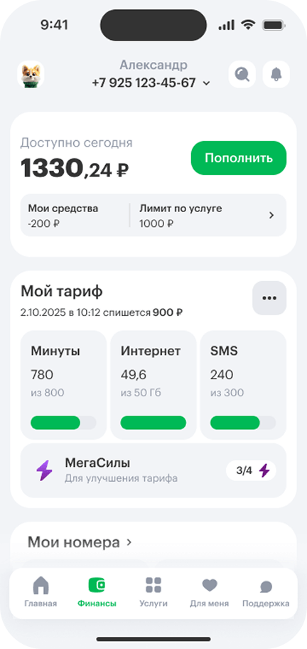 - 1Подключите экспресс‑лимит на 10 дней по команде *550*2# или в приложении «МегаФон»